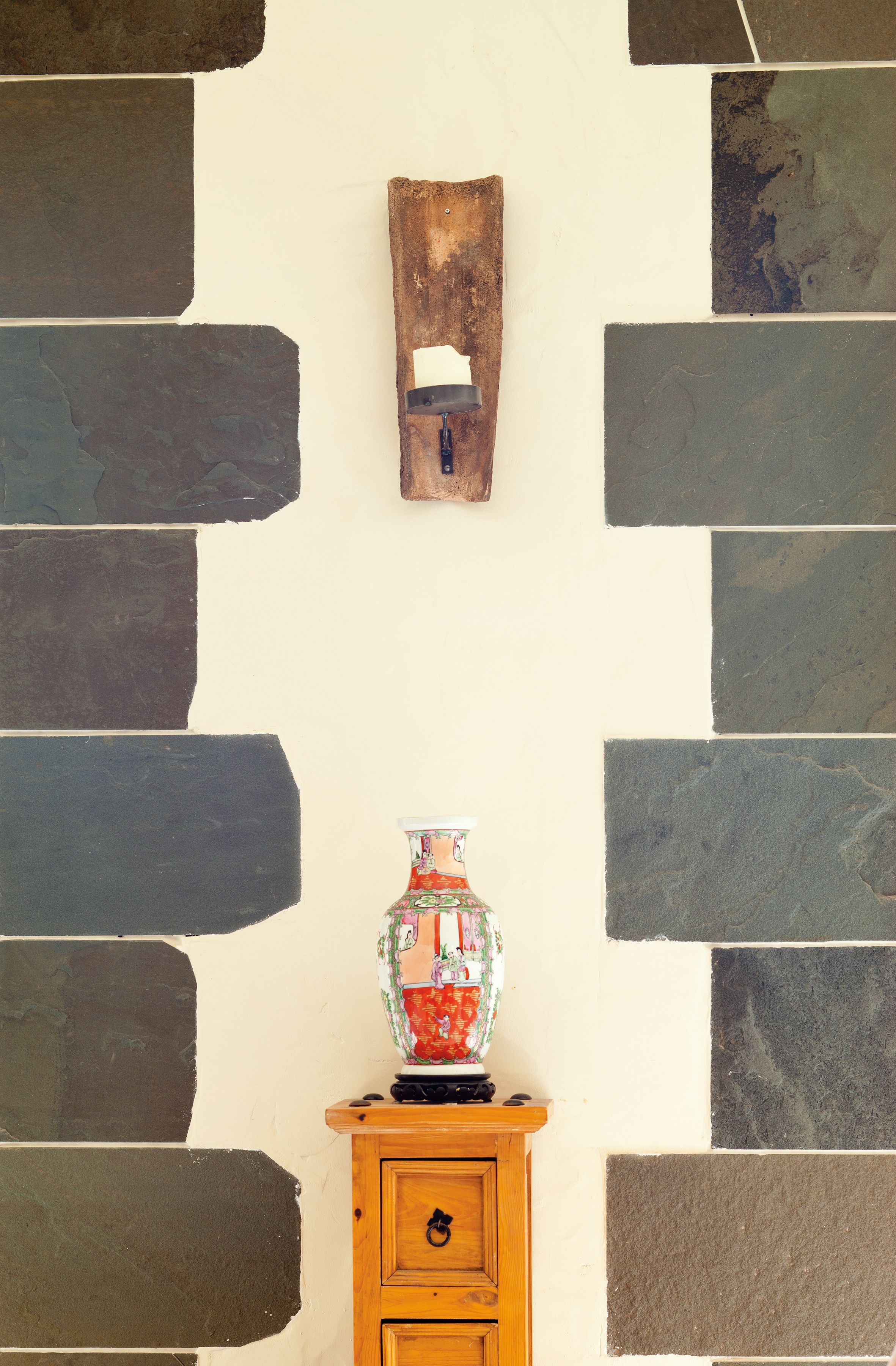 The defining element of the home is its elaborate use of stone, a love of which MacCaughern developed at an early age. “We moved to rural Connecticut when I was 8,” he recalls, “and when my dad cleared some land for a garden, I decided I wanted stone steps. I was too small to move rock, though. So apparently I directed my father on where to put the stones. By 12, I was building stone walls for my mother’s gardens, and at 22, while working as a dog trainer, I built stone walls for the owners of the kennel. That’s when I decided stonemasonry was what I wanted to do.” A stalwart fan of the traditional dry-stack method that he grew up observing in the old stone walls of New England, he meticulously placed thousands of rocks in his home, to beautiful effect.