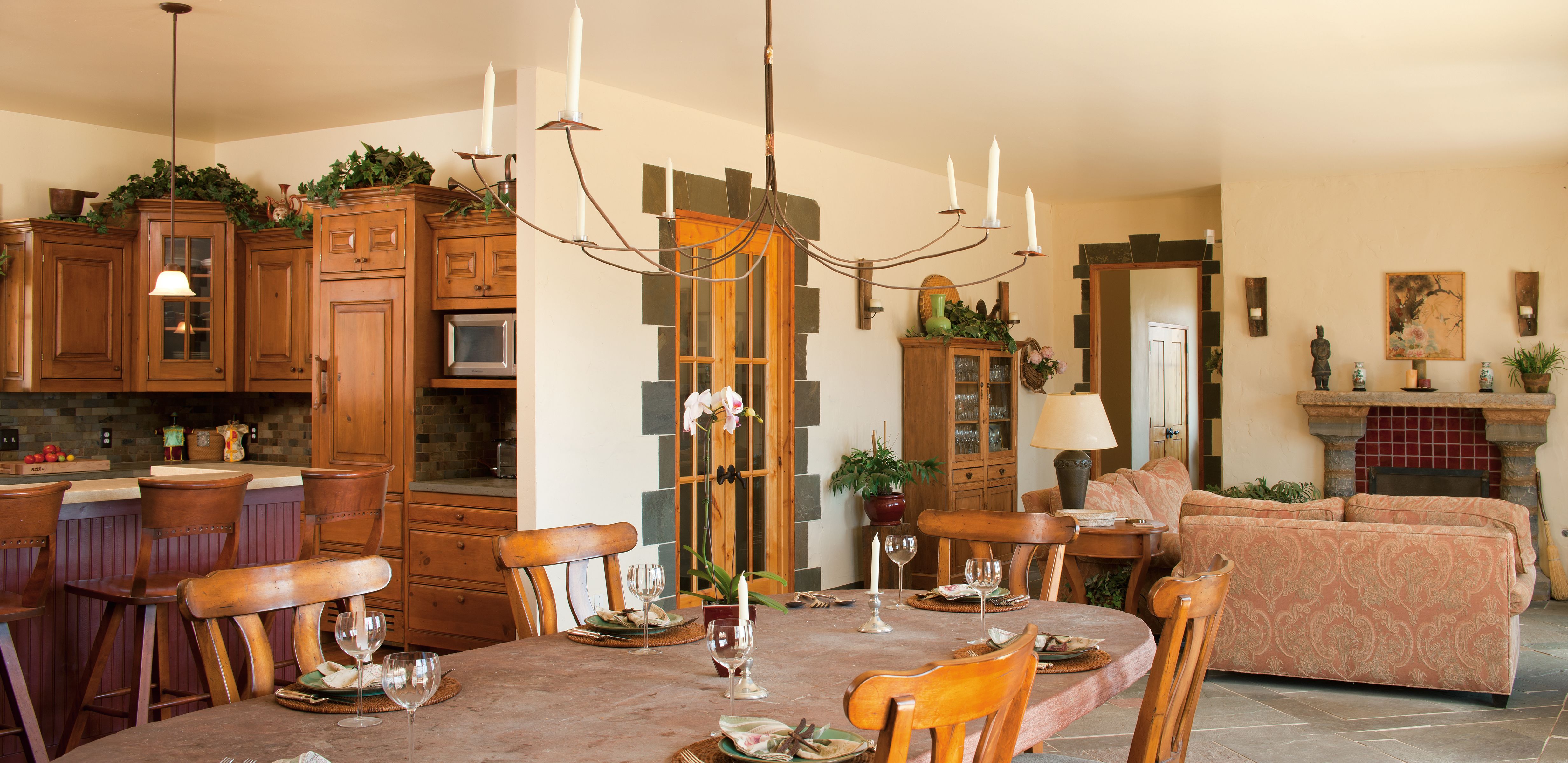 The rest of the stone in the house was harvested closer to home. “In old Europe, people showed off their level of wealth with their stonework. If we were really wealthy, all of our stone would have been from the local quarry—but we could only afford cornerstones from there. The rest of the stone came from our own land,” MacCaughern explains. “I like the mix.” The uniquely beautiful façade on the outside of the house is a combination of volcanic stone that MacCaughern harvested from his property and limestone from southern Utah. The stone terraces outside were built with sandstone from a local quarry. MacCaughern estimates that he has already used about 300 tons of stone in the retaining walls, the house itself, and the patio—“and counting,” he adds, as he’s still finishing the outdoor living spaces.