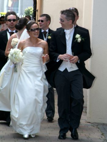 MS: Because I don’t want to confuse anyone, I will be really precise in my answer to this question. Read carefully: If you are posing in front of a camera, sure, go ahead and wear your sunglasses. Wedding pictures with people in sunglasses have been taken with every combination under the sun: bride and groom, groomsmen, bridesmaids, groom and best man... Whatever the combination, if you have to snap a photo in shades, then do it and get it over with.