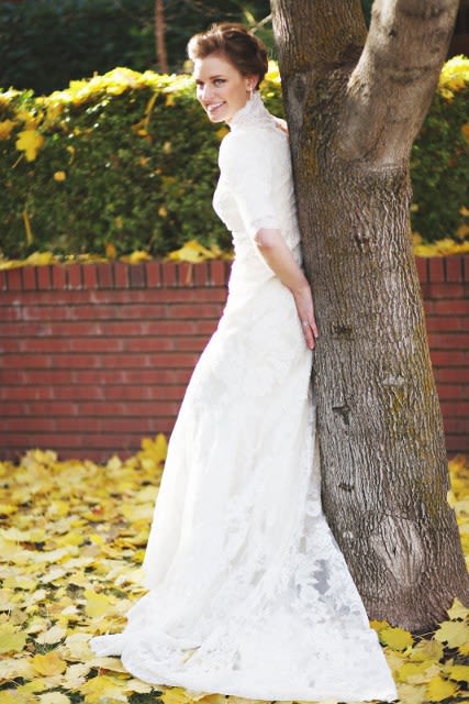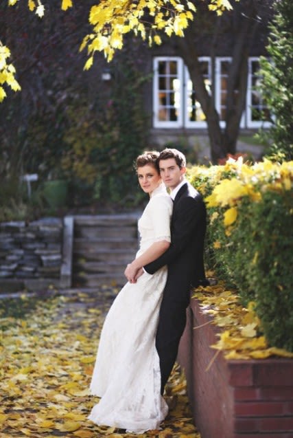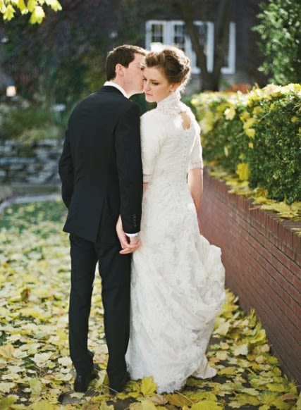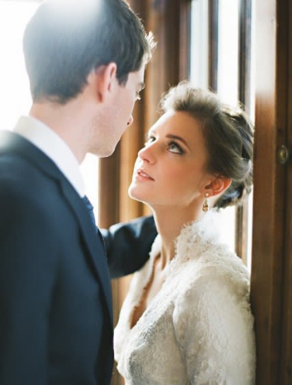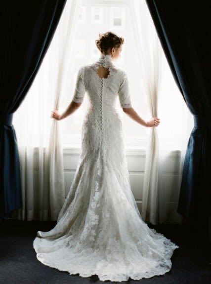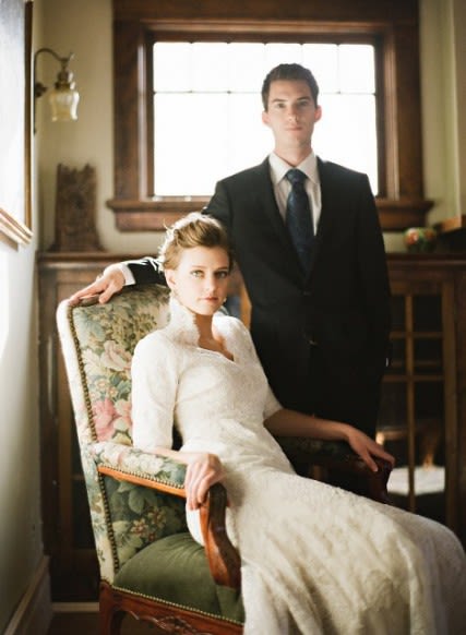 When I first saw these images of bride-to-be Noelle (her fiance Tim joined her for some of the photos, too), my first thought was, "Kate Middleton." From her regal lace dress, complete with a high collar and elbow-length sleeves (purchased at The Perfect Dress) to her perfectly coiffed updo (courtesy of Biz Lalli from Lunatic Fringe Salon), Noelle is every bit as elegant and polished as Princess Catherine. I'm completely enamored.