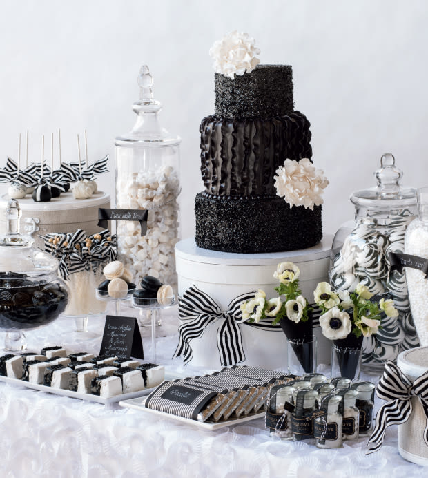 Vera Wang sent black bridal gowns down her fall 2012 runway, and now bakers are following suit fashioning dark, dramatic confections for contemporary nuptials. Tasha Mitchell of CAKE-A-LICIOUS (801-938-2818, cakealicious.net) used homemade black vanilla-butter fondant to cover this Parisian-inspired red velvet cake filled with cream cheese buttercream and white chocolate ganache. The top and bottom tiers sparkle with edible glitter and handmade sugar peonies, while the extra-tall middle tier dazzles with vertical fondant ruffles. Because dark icing can stain guests’ teeth, Mitchell avoids buttercream for black cakes and, instead, employs a homemade, fat-free fondant (fat causes color to spread) applied in a thin layer to minimize ghoulish grins. Riehl Events’ filled a variety of glass containers with licorice pinwheels, rock sugar candy sticks, saltwater taffy, SweeTart candy flowers, and CULINARY CRAFTS' (801-355-6575, culinarycrafts.com) meringue “kisses” to create a chic candy buffet. Custom-wrapped Swiss chocolate bars, confection-filled SHUGLOVE (801-300-5221, shuglove.com) favor jars, and Culinary Crafts' brownie cake pops, dark chocolate–dipped homemade marshmallows, and black licorice and white crème anglaise macarons fill out the sweet spread.
