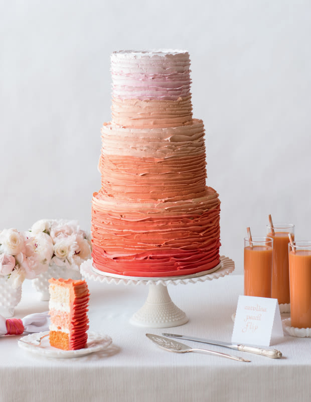 Layered fondant ruffle cakes in ombré color palettes are popular for 2012 weddings, but SUGAR KISSES CAKES BY DESIGN’s owner Turia Larsen (801-598-7338, sugarkissescakes.com) put a fresh spin on the frilly style when she designed this three-tier confection using buttercream for smoother texture. Larsen says ombré cakes look best with three to five subtle color changes—she frosted ours from light to dark in pink, peach, and coral. To complement this peach-vanilla cake with fresh peach and mascarpone filling, Riehl Events mixed up Carolina Peach Flip cocktails, inspired by the South’s fruity pecan dessert of the same name.