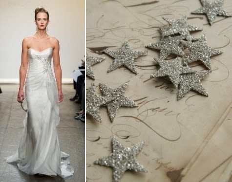 Every summer, as the Fourth of July approaches, our obsession with stars begins to skyrocket. When we think of summer, we think of warm, lazy nights spent gazing up at star-encrusted skies high above city parks and mountain campsites. On the Fall 2012 fashion runways, starry styles shone bright, and the trend is now orbiting the wedding world. We love the twinkling, 5-pointed shape as an accent for bridal dresses and accessories or as a pattern for reception decor and paper goods. Be inspired by our round-up of starry finds for sparkling summer soirees!