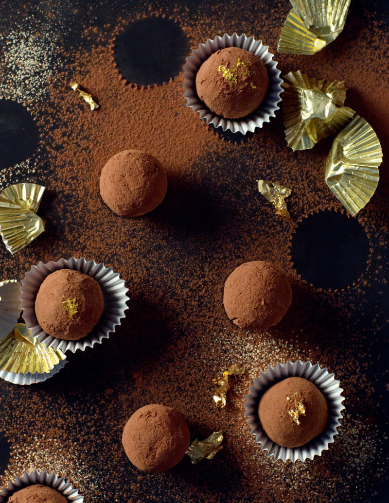 To complement their cake, the gals of Garni whipped up a batch of rich truffles using Ghirardelli bittersweet chocolate and Winder Dairy heavy whipping cream. They rolled the bon bons in cocoa powder and topped with edible gold and sprinkles.