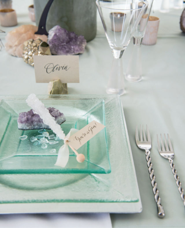 Calligraphy paper goods, including hand-painted watercolor invitation suites sealed with vintage mineral stamps, are all one-of-a-kind—just like the locally sourced stones scattered throughout the setting. Swizzle-stick rock candy favors and a sparkling three-tier fondant and rock candy cake tie the gem theme together.