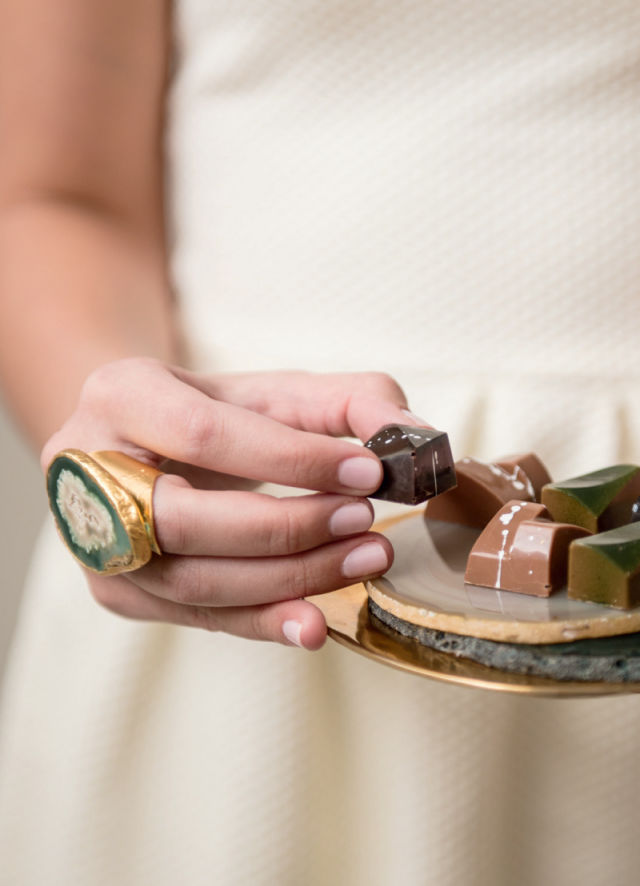 Winward worked with Elpitha Tsoutsounakis of Print In Cursive to design gold-foiled menus, agate table numbers, and agate place cards, which she says double as wonderful gifts for guests. The elegant gold touches, refined wood chairs, and modern light fixture elevate the setting’s natural elements. Gourmet chocolates reminiscent of glossy stones are a sweet way to say goodnight to guests.