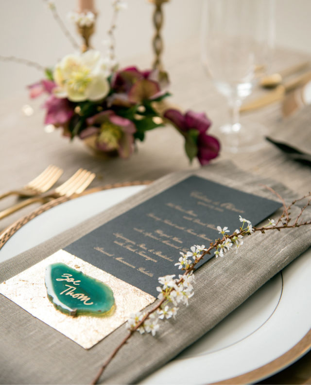 Designer, chairs, lighting, flowers, vases, chargers Honey of a Thousand Flowers (801-231-3088, sarahwinward.com) Table, dishes, glasses, flatware Diamond Rental (801-262-2080, diamondrental.com) Linens La Tavola (702-383-3337, latavolalinen.com) Custom menus and gold foil on table number and place cards Elpitha Tsoutsounakis, Print In Cursive (801-557-9987, printincursive.com) Chocolates Chocolatier Blue from Tony Caputo’s Market & Deli (801-531-8669, caputosdeli.com) Agate ring Katie Waltman Jewelry (801-558-1792, katiewaltman.com)