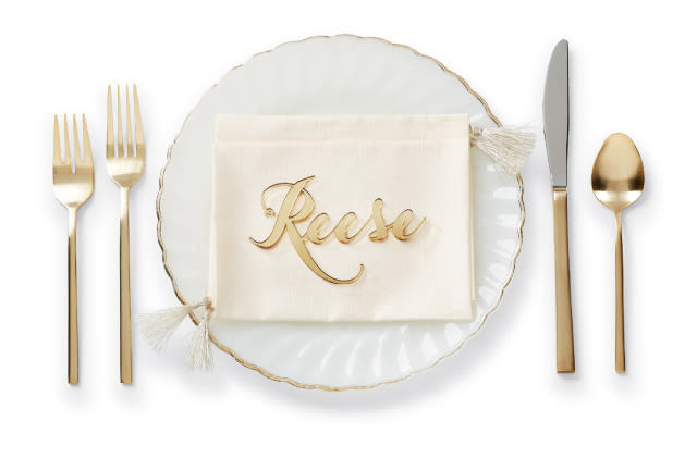 To create this glam place-card-turned-party-favor, the team at MOOD Events worked with Alexis Mattox Design to laser-cut a name in gold acrylic mirror, and placed it atop a custom setting accented with handmade metallic tassels. Prices vary according to services. MOOD Events & Production, 801-610-9427,