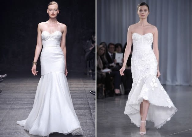 If the words "bustier" and "bridal" make you think of Madonna's 1984 album "Like a Virgin", think again—we spotted glamorous bustier-style wedding gowns by the likes of Amsale, Monique Lhuillier, Vera Wang, and others, strutting their stuff down the Fall 2013 bridal fashion runways. More bridal than boudoir, these bustier bodices are like sexier, grown-up versions of sweetheart necklines. We love this look for brides tying the knot at an elegant urban event or modern ballroom bash.