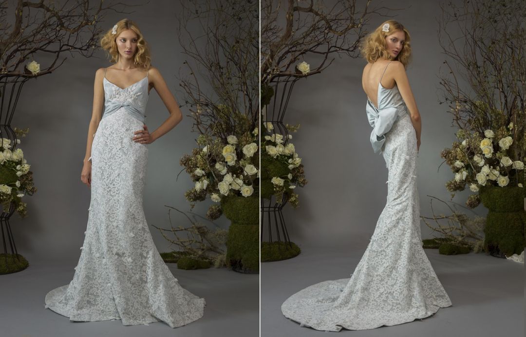 Our favorite dresses in Fillmore's new collection include Gisele, a satin bias sheath with a sheer "Serpentine" beaded back; Josephine, a powder blue silk taffeta and "Vine" lace empire gown with beaded bodice and a dramatic bow at the back; and Shanghai, an embroidered "trellis" tulle fitted shift dress with bracelet sleeves and a keyhole back. Which gown is your favorite?