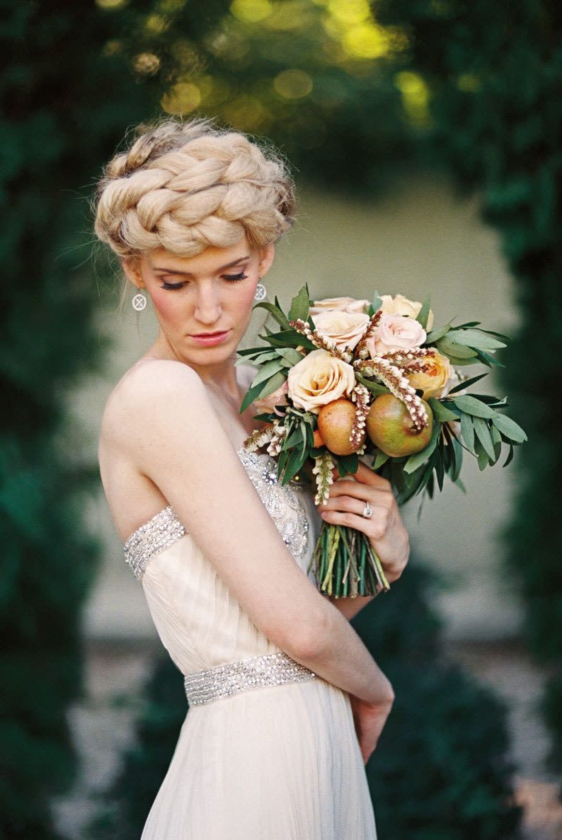 If you’re the type of bride who has read every Jane Austen novel cover to cover and never misses four o’clock tea time, you’ll swoon over this Downton Abbey-esque bouquet by Audrey O’Brien of Studio Stems. Inspired in part by the European-like gardens at Thanksgiving Point, O’Brien combined soft blooms and rich foliage to create the textural arrangement: Juliet English garden roses, snapdragon, smilax vine, snowberries, tulips, blueberry thistle, blushing bride protea, and fresh mint snipped from her own garden. “Fresh herbs really bring unique flavor to your bouquet, both in texture and scent,” she explains. O’Brien says the bouquet is well-suited for green-thumbed gals with outdoor weddings in spring, summer, and fall, though most of the blooms are available all year.