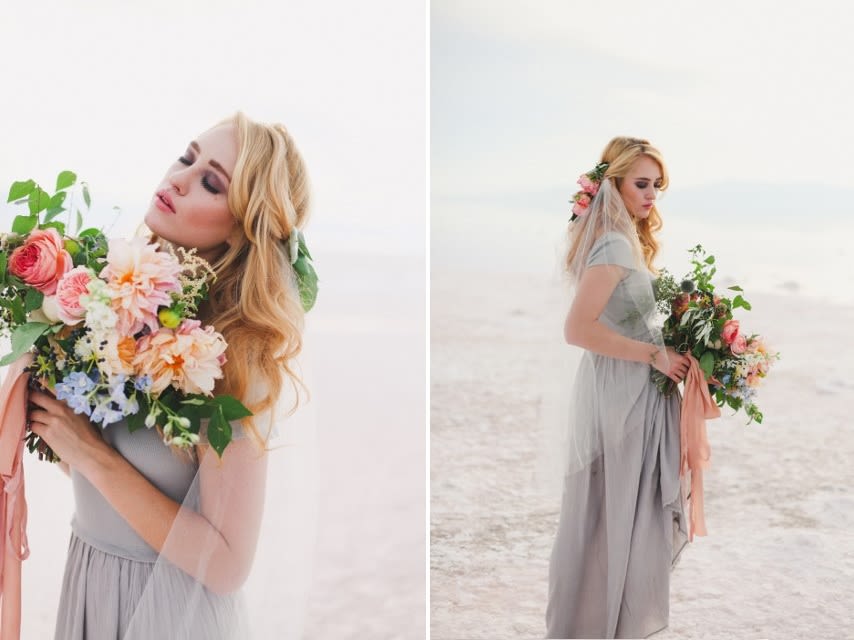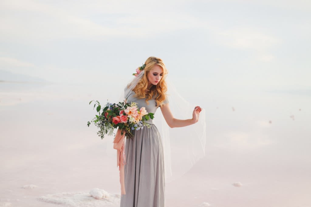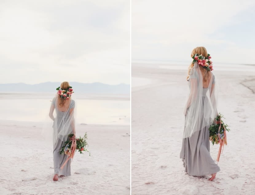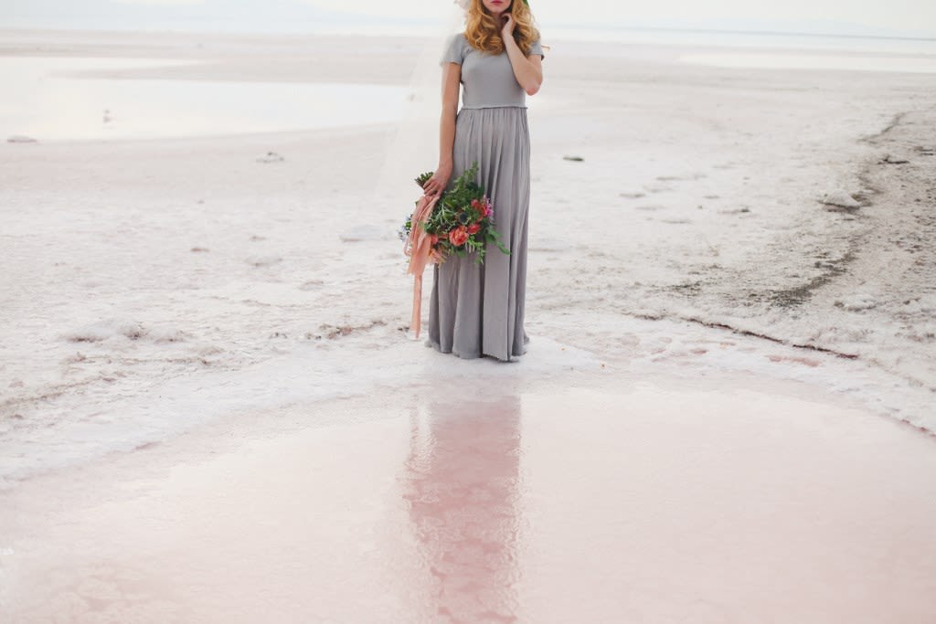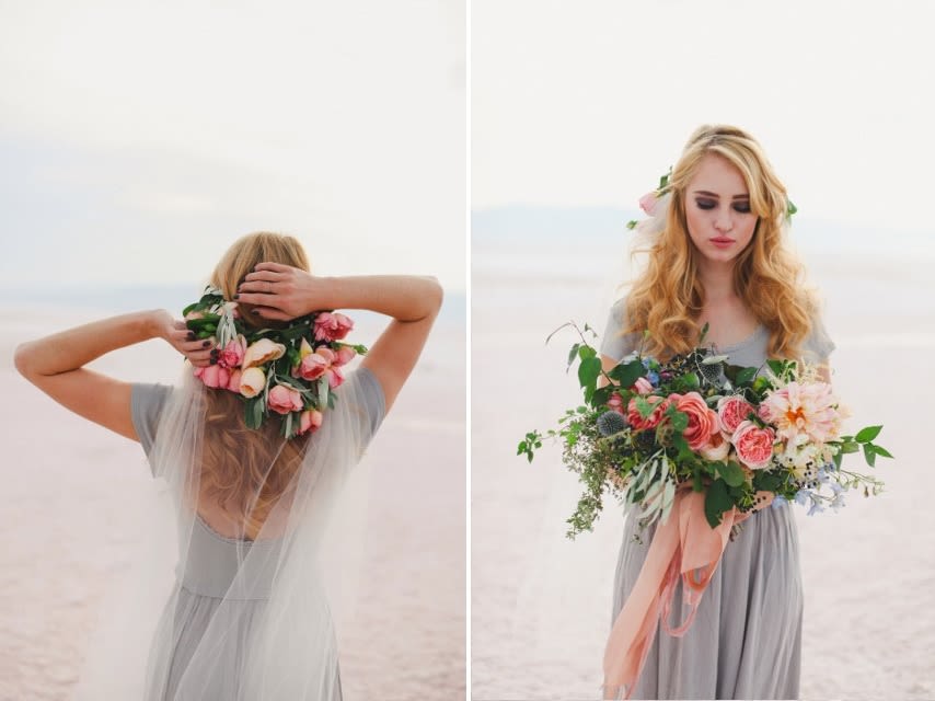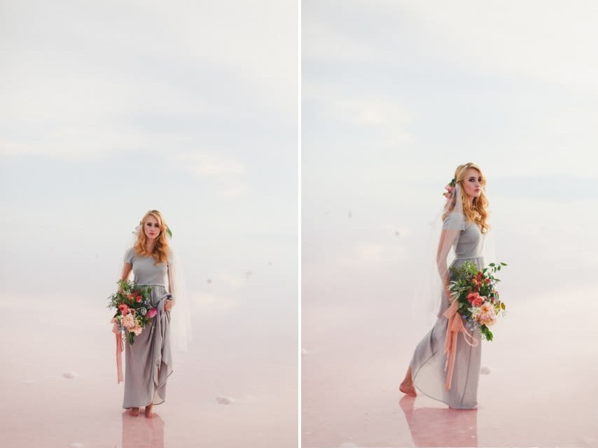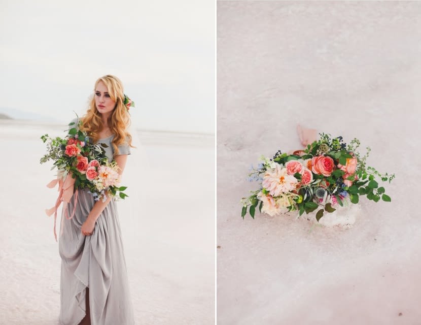 There's a stark, strange beauty to Utah's Great Salt Lake and Salt Flats. The local waters and salty shores set the scene for this hauntingly gorgeous bridal shoot by Soil & Stem and Evelyn Eslava Photography. The dramatic landscape, soft light at sunset, and a wash of pastel hues create a dreamy, otherworldly setting featuring rose waters, pink salt, and wildly romantic blooms.