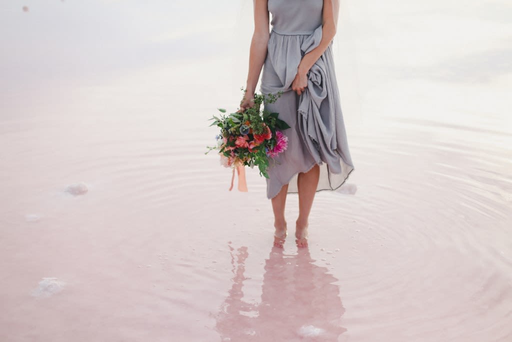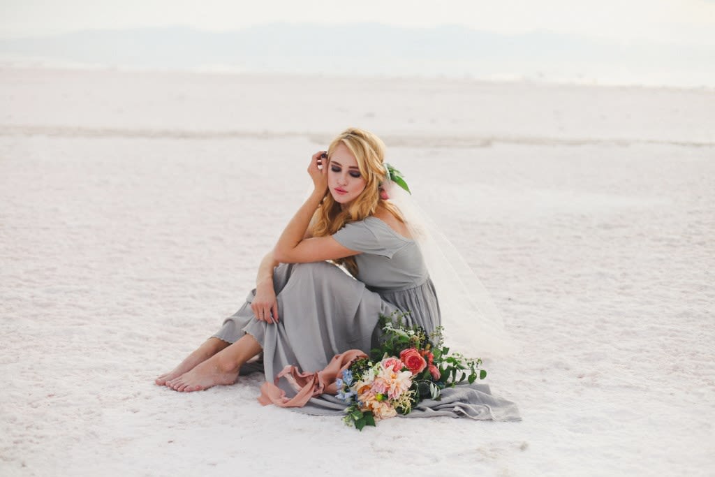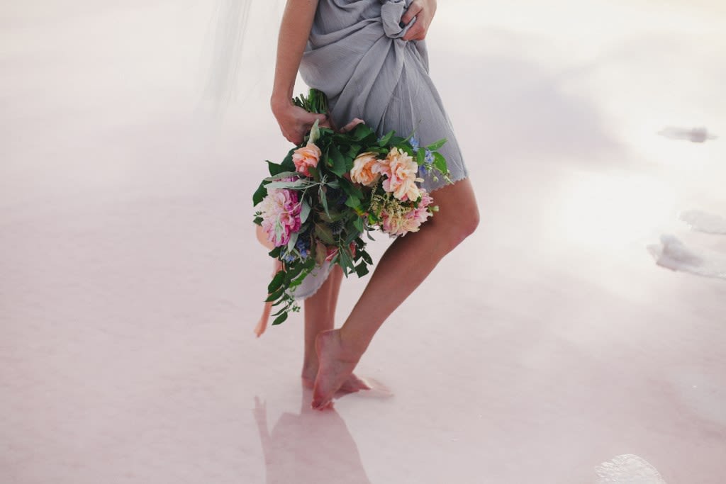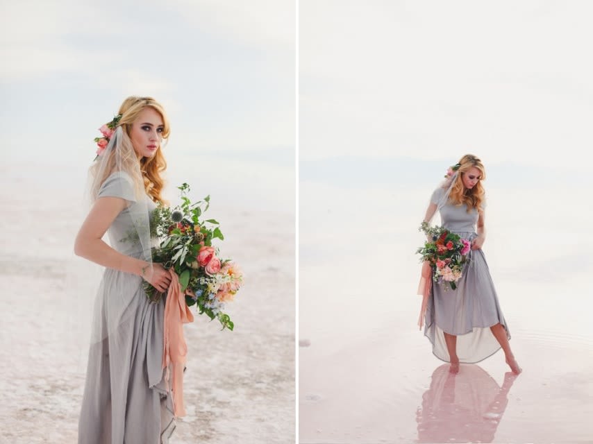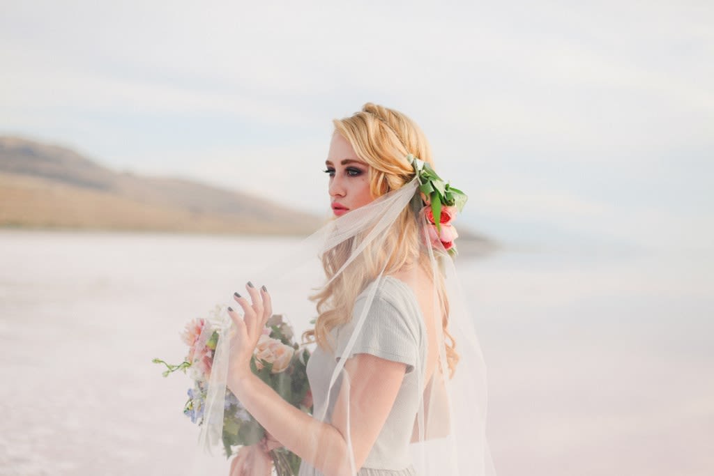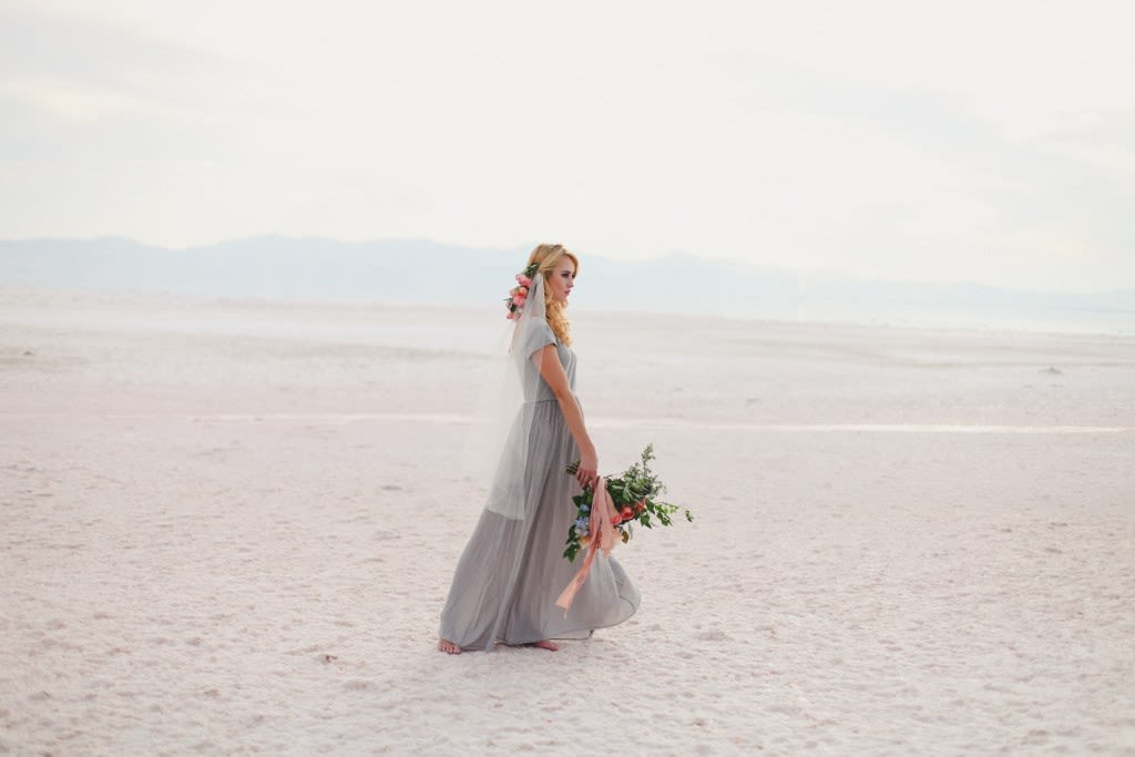 There's a stark, strange beauty to Utah's Great Salt Lake and Salt Flats. The local waters and salty shores set the scene for this hauntingly gorgeous bridal shoot by Soil & Stem and Evelyn Eslava Photography. The dramatic landscape, soft light at sunset, and a wash of pastel hues create a dreamy, otherworldly setting featuring rose waters, pink salt, and wildly romantic blooms.