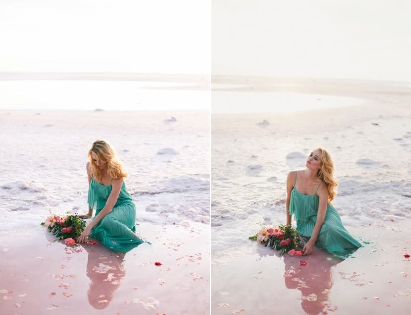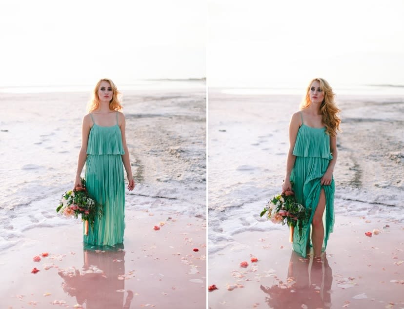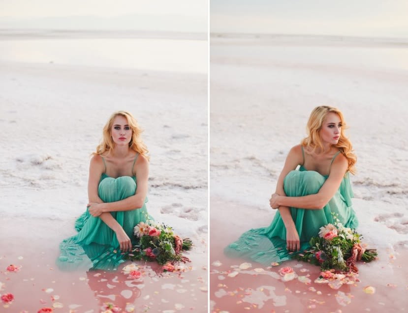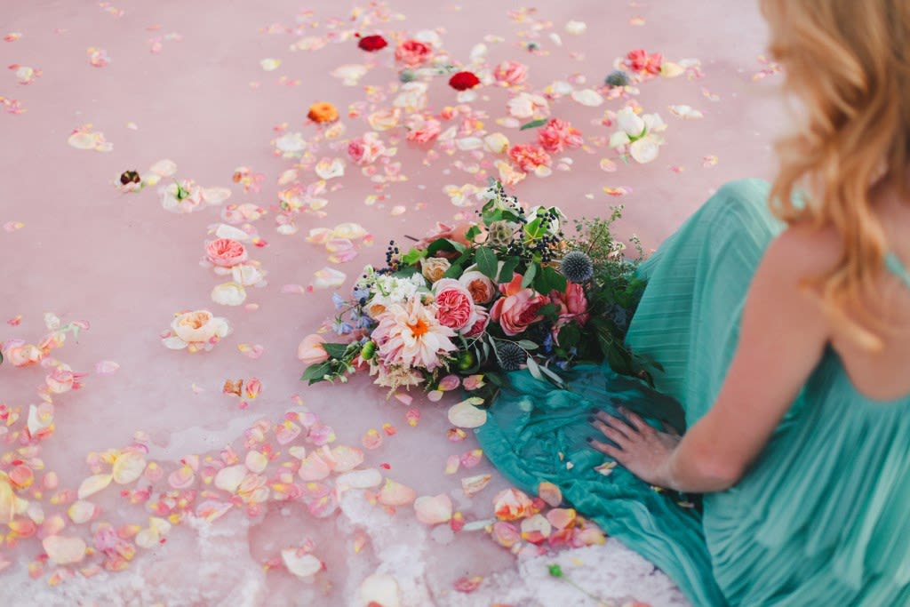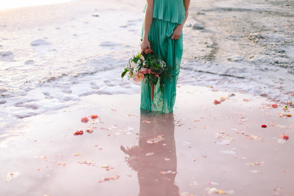 Inspired by the bizarre yet beautiful landscape of the Great Salt Lake and the dusty pink hue of the area's salted earth, this Rose Waters x Pink Salt inspiration shoot is dramatic, romantic, and otherworldly. Today, enjoy part II, featuring scattered rose petals, salt crystals, candy-colored waters, and a drenched seafoam-green wedding dress.