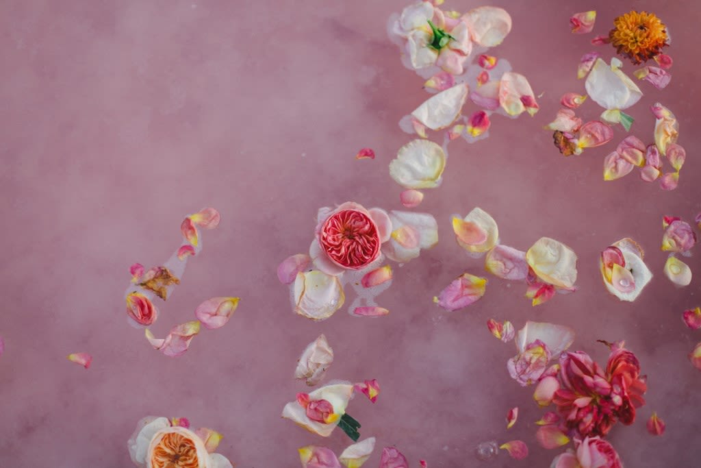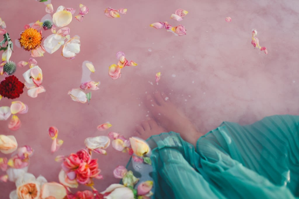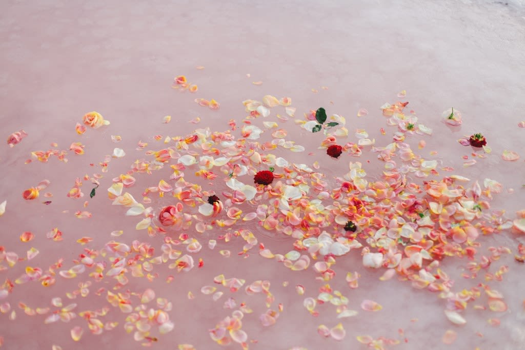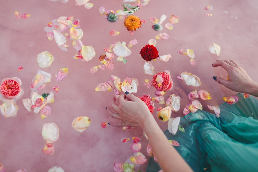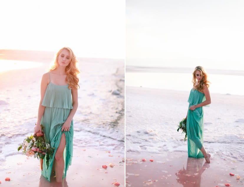 Inspired by the bizarre yet beautiful landscape of the Great Salt Lake and the dusty pink hue of the area's salted earth, this Rose Waters x Pink Salt inspiration shoot is dramatic, romantic, and otherworldly. Today, enjoy part II, featuring scattered rose petals, salt crystals, candy-colored waters, and a drenched seafoam-green wedding dress.