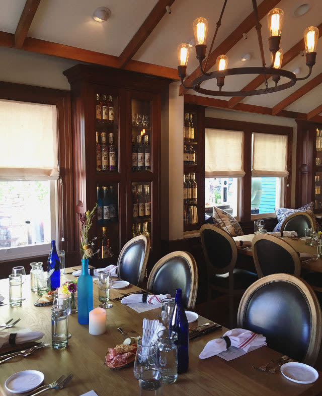 On a recent visit, our evening began with whiskey cocktails and hors d'oeuvres served on the cottage's sunny patio. We ordered a round of whiskey sours (yum), followed by the Dead Man's Boot, made with whiskey, tequila, lime juice, and ginger beer (double yum and dangerously drinkable—hence the name?). After cocktail hour, our small group moved inside for supper—there were less than 12 of us dining together—and took our seats on leather chairs at communal wood tables decorated with blue High West Vodka bottles filled with colorful wildflowers.