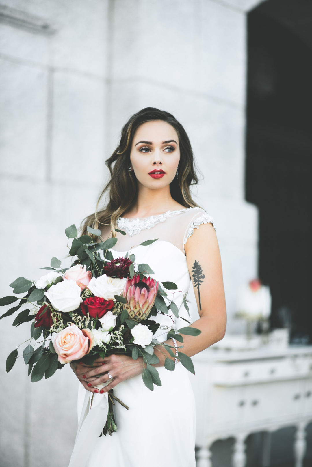 With classic lady-like elegance and Old Hollywood-era glamour in mind, makeup artist KarLee Gibbons from Lure Make-Up Artistry organized this styled bridal shoot with Rachel Laukat Photography, Bitsy Bridal, and more local vendors. "For this shoot I wanted to capture elegance and everything that encompasses the timeless wedding look with a flawless, red-lipped bride," explains Gibbons. See the glam photos below, and scroll down for the full vendor list.
