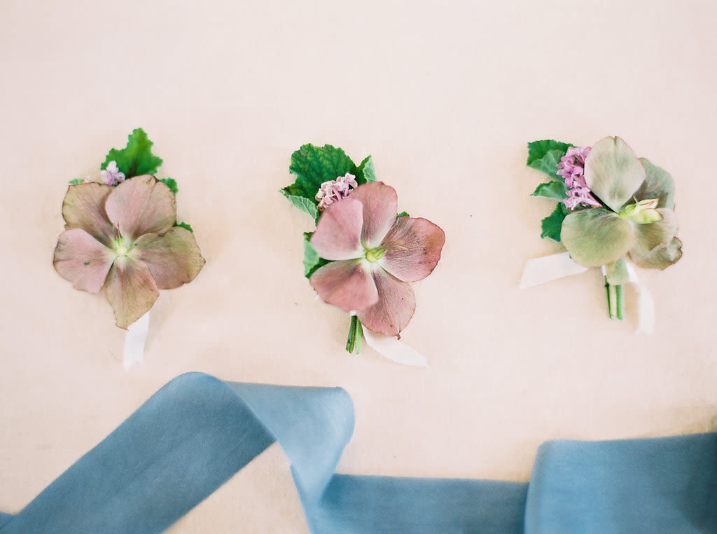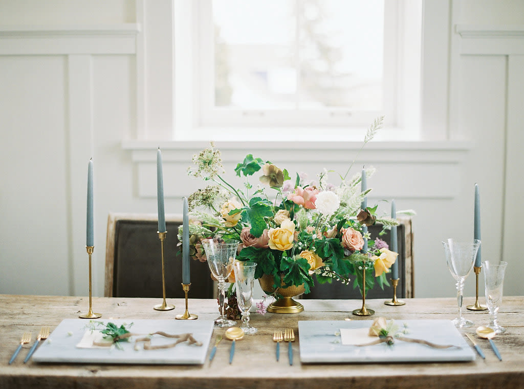 Photographed by Mary Claire at the Washington School House, the white walls and modern, yet antique accents in the space, create a dreamy scene for any bride and groom. Rachael incorporated "soft pops of french blue, caramel, and cafe mauve," complimenting the whimsical surrounding atmosphere while still adding to it.