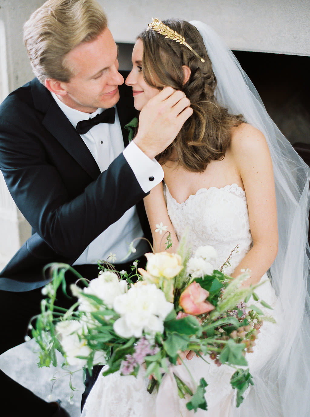 These muted-toned boutonnieres and antique square-shaped engagement ring are what wedding dreams are made of. Oh, and can we talk about this veil? It could work for a simple silk gown or romantic lace fit-and-flare like this one. The lace design and cathedral length of the veil could add an illusion train or add more drama to your existing train.